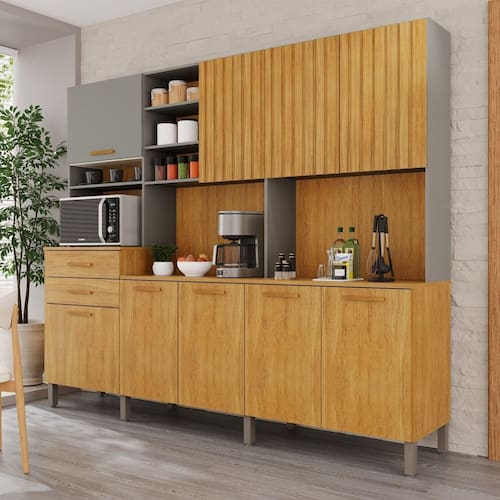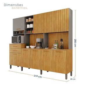 Transforme o estilo e a funcionalidade da sua cozinha com o Kitão Louvre. Este móvel é a combinação ideal de praticidade e elegância, projetado para atender às suas necessidades diárias. Com 2 gavetas que possuem corrediças telescópicas e 9 portas, incluindo um espaço específico para o micro-ondas, o Kitão Louvre oferece amplo armazenamento para todos os seus utensílios de cozinha. A pintura UV de alta qualidade proporciona um acabamento durável e resistente, enquanto os pés ajustáveis garantem estabilidade e adaptabilidade ao seu espaço. Com 3 prateleiras internas, você pode organizar seus itens de maneira eficiente. As portas superiores apresentam detalhes ripados elegantes, que acrescentam um toque de sofisticação ao ambiente. Acabamento da Prateleira: Pintura UV Escala de Brilho da Prateleira: Semi-Brilho Acabamento da Gaveta: Pintura Texturizada UV Acabamento da Porta: Pintura UV Escala de Brilho da Porta: Semi-Brilho Acompanha Tampo: Sim Ambiente Principal: Cozinha Balcão Suporta Pia: Não codigo_ean: 7900288121219 Complexidade da Montagem: Média: pode ser montado por mais de uma pessoa e/ou necessite de maior conhecimento para montagem Cor: Cinamomo / Cinza Acetinado Cor do Produto: Cinamomo / Cinza Acetinado Escala de Brilho: Semi-Brilho Gaveta com Chave: Não Itens Inclusos: 1 Kit de Cozinha, Manual de Montagem e Kit Ferragens. Manual de Montagem e Instalação: https://product-hub-prd.madeiramadeira.com.br/218884745/documents/749eb810-442e-49bb-956b-848bd9bf64352853265524617446626467721.pdf Marca: CHF Material da Dobradiça/Corrediça da Porta: Metálica Material da Gaveta: MDP Material da Porta: MDP Material da Prateleira: MDP Material do Tampo: MDP Material dos Pés: Polipropileno modular: Não Necessita Montagem: Sim O Balcão Acompanha Pia: Não Origem do Produto: Nacional Pés Reguláveis: Sim Peso: 105,4 kg Peso Máximo por Gaveta: 3 kg Peso Máximo por Prateleira: 5 kg Possui Pés: 08 Possui Portas: Sim Possui Prateleiras: Sim Possui recorte para Cooktop: Não Possui Rodízio: Não Produto Montado: Sim Recomendações de Uso, Manutenção e Limpeza: Pano levemente umedecido, não utilizar solventes nem produtos de limpeza. Sapatas Niveladoras: Não Sistema de Montagem: Parafusos e Cavilhas. Tamanho Indicado da Pia: 40 x 40 Tipo de Corrediça da Gaveta: Metálica Telescópica Tipo de Dobradiça da Porta: 35 mm Tipo de Puxador da Gaveta: Externo Tipo de Puxador da Porta: Externo