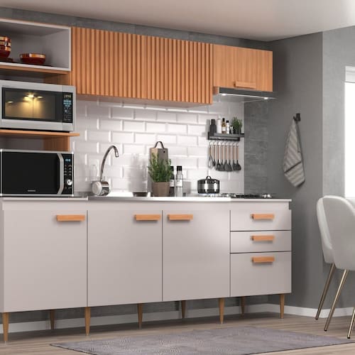 A Cozinha Compacta Antonela é uma cozinha ideal para você ter na sua casa. Com suas medidas de 200 cm de altura 243 cm de comprimento e 53 cm de profundidade. Possui uma porta basculante com Ripado e pistão a gás, três gavetas com corrediças telescópicas. Com espaço amplo e torre quente para micro-ondas e forno elétrico. Acabamento da Prateleira: Finish Foil Escala de Brilho da Prateleira: Fosco Acabamento da Gaveta: Finish Foil Escala de Brilho da Gaveta: Fosco Material do Puxador da Gaveta: MDF Acabamento da Porta: Finish Foil Escala de Brilho da Porta: Fosco Material do Puxador da Porta: MDF Acabamento dos Pés: Polipropileno Acompanha Tampo: Não Altura dos Pés: 17 cm Altura Máxima dos Pés: 17.0000 Ambiente Principal: Cozinha Balcão Suporta Pia: Sim codigo_ean: 7900288000866 Complexidade da Montagem: Média: pode ser montado por mais de uma pessoa e/ou necessite de maior conhecimento para montagem Cor: Freijó Cor do Produto: Freijó Cor Flex: Não Cor Interna: Freijó Escala de Brilho: Fosco Espessura do Material da Estrutura: 15 mm Gaveta com Chave: Não Itens Inclusos: 1 Cozinha completa kit ferragem + manual QR Code impresso na embalagem no kit ferragem de cada item Linha ou Coleção: 2025 Manual de Especificação Técnica: https://product-hub-prd.madeiramadeira.com.br/961120/documents/cc954842-33e5-47ea-b486-910aca4537672488670266217296937803719.pdf Manual de Montagem e Instalação: https://product-hub-prd.madeiramadeira.com.br/961120/documents/c4ca669d-2665-4614-81ac-e9e643eb9e0d251145926621730209689726.pdf Marca: j carvalho Material da Dobradiça/Corrediça da Porta: Metálica Material da Gaveta: MDP Material da Porta: MDP Material da Prateleira: MDP Material do Fundo: T-HDF Material dos Pés: Polipropileno Necessita Montagem: Sim O Balcão Acompanha Pia: Não Origem do Produto: Nacional Pés Reguláveis: Sim Peso: 103,5 kg Peso Máximo por Gaveta: 7 kg Peso Máximo por Prateleira: 10 kg Possui Pés: 09 Possui Portas: Sim Possui Prateleiras: Sim Possui recorte para Cooktop: Não Possui Rodízio: Não Possui Vidro: Não Produto Montado: Sim Recomendações de Uso, Manutenção e Limpeza: Flanela umedecida Sapatas Niveladoras: Sim Sistema de Montagem: parafusos Suporta Até (kg): 120 kg Tamanho Indicado da Pia: 120X53 Tamanho Indicado do Tampo: 120X53 Tamanho Indicado do Tampo ou Pia: 120x53 Tipo de Corrediça da Gaveta: Metálica Telescópica Tipo de Dobradiça da Porta: Simples Tipo de Puxador da Gaveta: Externo Tipo de Puxador da Porta: Externo