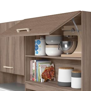 ESPECIFICAÇÕES: Estrutura em MDP Pintura UV 4 Portas de giro Dobradiças metálicas 1 Porta basculante Pistão a gás 1 Gaveta Corrediças telescópicas Espaço para micro-ondas Amplo espaço interno