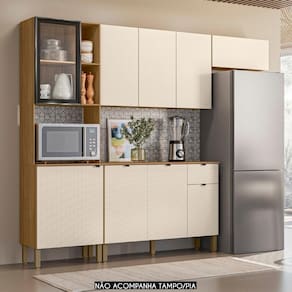 O Armário Aéreo possui três portas convencionais, enquanto o Armário de Geladeira apresenta uma porta basculante, todas passantes, dispensando o uso de puxadores, o que dá à composição um visual contemporâneo. O Balcão Para Pia vem com três portas convencionais com puxadores em alumínio e uma gaveta. Não acompanha tampo para que o uso fique opcional com tampo ou pia.