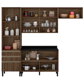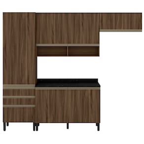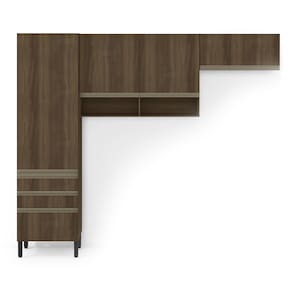 Formada por quatro módulos, ela possui paneleiro, armário aéreo, armário de geladeira e balcão. Produzida com material de altíssima durabilidade e design único, esse conjunto apresenta estrutura em MDP, discretos puxadores em alumínio, portas de bater equipadas com dobradiças com amortecedor e basculante com pistão à gás, acabamento em finish foil, além de pés fixos na medida certa.