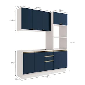 Complete sua cozinha com toda a beleza e praticidade que o Combo CB1299 da Cozinha Celeste da Kappesberg oferece. Compacto e funcional, ele conta com as divisórias perfeitas para manter seu espaço sempre organizado. Produzida em MDF de 15mm, o que proporciona robustez, firmeza e qualidade, além de um acabamento perfeito, o combo possui três peças, encaixando facilmente em todos os ambientes. E com até sete camadas de pintura, a caixaria é em pintura na cor branca e acabamento brilho, enquanto as frentes são na cor azul profundo com acabamento fosco. Uma combinação marcante e moderna, perfeita para quem busca por design e estilo em cada detalhe, deixando sua cozinha com um diferencial único. Com módulo para eletrodomésticos, o kit forno e microondas possui prateleiras reforçadas em 25mm, garantindo o máximo de segurança. Com três peças, o conjunto possui 2,30m de altura e 1,92m de largura, uma ótima opção para quem possui pouco espaço mas não abre mão de organização. E para um melhor acabamento, o combo possui pés, mas acompanha as ferragens para ser montado suspenso na parede, deixando sua cozinha do seu jeito. Os diferenciais ficam por conta das dobradiças com amortecimento, garantindo um fechamento suave e sem ruídos, das corrediças telescópicas e os puxadores na cor dourada, com modelos diferentes no balcão e aéreos, completando o estilo e a qualidade do produto. Viva momentos especiais e renove seu espaço com a Cozinha Celeste da Kappesberg.