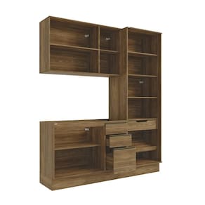 Acabamento: Pintura Touch | Cor: Nogueira | Corrediças: Telescópicas | Dobradiça: Com Amortecimento | Garantia: 3 meses para defeito de fabricação | Matéria-prima: MDF / MDF/ Vidro | Peso suportado por cada gaveta: 6 Kg | Peso suportado por cada prateleira: 7 kg | Puxadores: Metálicos / Puxadores de Metal e de Alumínio | Quantidade de gavetas: 1 / 3 | Quantidade de portas: 2 / 3 | Quantidade de prateleiras: 1 / 2 / 5 | Sistema de montagem: Parafuso Philips | Tipo de porta: Bater | Tipo de móveis de cozinha: Cozinha completa