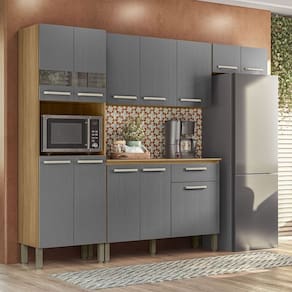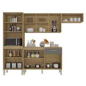 O Balcão dispõe de três portas e uma gaveta, e seu tampo serve como apoio para eletrodomésticos e itens do dia a dia, deixando tudo sempre ao alcance das mãos. Já o Armário Aéreo vem com três portas, enquanto o Armário de Geladeira, com duas portas, complementa o conjunto de forma harmoniosa e eficiente. Com amplo espaço de armazenamento, possui cinco prateleiras internas para acomodar utensílios, louças e mantimentos.