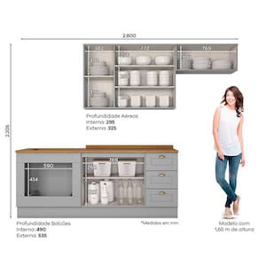 FICHA TÉCNICA: Cor Interna: Na versão Branco HP é Trama Branco e na versão Cinza é Trama Acabamento: Pintura UV Texturizada Escala de Brilho: Fosco Material do Fundo: MDF Material Principal: MDF Qtd. Gavetas: 03 Und Peso Máximo por Gaveta: 3 Kg Material do Puxador Gaveta: Metal Zamac Material da Corrediça: Metálica Telescópica Material da Gaveta: MDF Qtd. Portas: 6 Und Material da Dobradiça: Metálica em 35mm com fechamento suave -Amortecimento-. Material do Puxador Porta: Metal Zamac Tipo Porta: Bater e Basculante Qtd. Prateleiras: 4 Und Peso Máximo por Prateleira: 8 Kg Material da Prateleira: MDF Qtd. Pés: Possui rodapé Altura Pés/Rodapés: 14,5 Cm Balcão Acompanha Pia: Não Tamanho Indicado da Pia: 120cm x 52cm Acompanha Tampo: Sim Material do Tampo: Na versão Calcare é MDP BP e na versão Nature é MDF Produto Suporta até -Kg-: 145 Kg Possui balcão para Forno de Embutir: Sim Tampo possui recorte p/Cooktop: Sim Medida Recorte p/Cooktop: 51,5 x 36 Cm Medidas Conjunto Montado -AxLxP-: 220,5 x 280 x 53,5 Cm Peso Conjunto Montado: 121,5 Kg