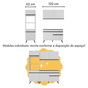 Cozinha Compacta Com Bancada Americana/mesa Veneza Multimóveis Mp2211 Branco/preto Branco/preto O Cozinha Compacta com Bancada Americana/Mesa Veneza Multimóveis MP2211 é produzido em MDP com acabamento acetinado (cerca de 20% de brilho), oferecendo durabilidade e um toque sofisticado. Com 6 portas, sendo 2 basculantes, 1 gaveta com corrediças metálicas (mais leveza no manuseio) e módulo para forno e micro-ondas, a cozinha proporciona amplo espaço interno de armazenamento. Os pés retrô em polipropileno e os puxadores em ABS adicionam charme extra ao design. Os tampos do balcão (suporta até 15kg) e da bancada (suporta até 20kg), ambos de 15mm, garantem resistência. Os módulos são individuais, permitindo a montagem de acordo com o espaço disponível. Versátil, o balcão possui tampo removível (compatível com pia de 120cm) e compartimento especial para utensílios mais altos. A bancada inclusa conta com 1 porta, prateleira interna e adega embutida, permitindo acomodar bebidas e itens mais utilizados no dia a dia, além de poder ser utilizada como divisora de ambientes. Este conjunto é uma ótima opção para agregar estilo e praticidade no lar! Conteúdo da Embalagem: 1 (um) Armário Aéreo 120cm 1 (um) Balcão com Tampo 120cm 1 (um) Armário para Forno e Micro-Ondas 62cm 1 (uma) Bancada/Mesa Manual de Montagem Kit Ferragem