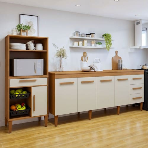 O(a) Cozinha Compacta Cuiaba 5 Portas 4 Gavetas Natural - Kaiki Móveis é produzido em MDP na escala de brilho Fosco, e possui um grau de dificuldade de montagem: Médio.