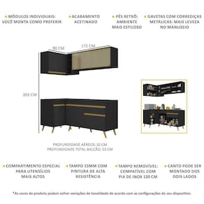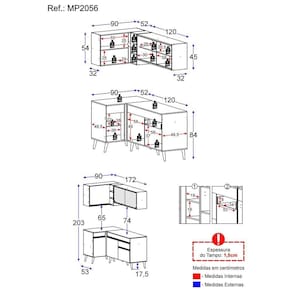 Altura: 203cm | Largura: 90 x 172cm | Profundidade: 32cm (aéreos) - 53cm (balcão com tampo)