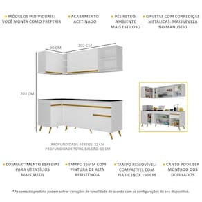 Conteúdo da Embalagem: 1 (um) armário aéreo de canto 90cm 1 (um) armário aéreo 150cm 1 (um) balcão com tampo de canto 90cm 1 (um) balcão com tampo 150cm