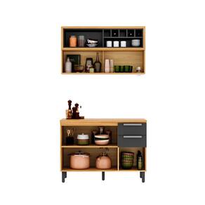 Os puxadores metálicos e os pés reguláveis proporcionam estabilidade mesmo em pisos irregulares, enquanto os nichos do aéreo acrescentam charme e funcionalidade.
