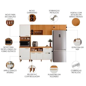 O Armário de Cozinha é composto por um Paneleiro com duas portas, um compartimento para micro-ondas ou forno elétrico e um nicho para temperos. O Armário Aéreo conta com três portas com detalhe em ripado frisado, além de um nicho decorativo e dois nichos adega para acomodar seus rótulos favoritos. Já o Armário de Geladeira acompanha duas portas com o mesmo detalhe ripado, garantindo um visual harmonioso.