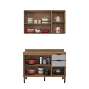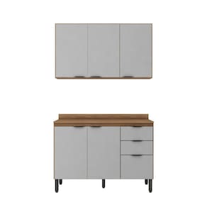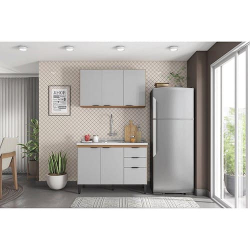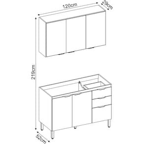 A cozinha FIRENZE composição 09 é formada por dois módulos, um Armário Aéreo 3P 120cm e um balcão 120cm com 3 portas e 2 gavetas para pia. Seus pés são de