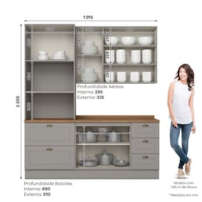 Medida de cada item (A x L x P): 1 Aéreo 3 portas 83x120x32,5 cm, 1 Balcão Pia 03 Gav e 02 Ptas 82x120x53,5 cm C/ tampo, 1 Torre Quente 220,5x71,5x53,5 cm.