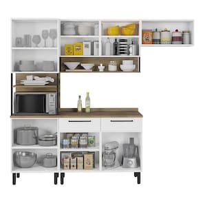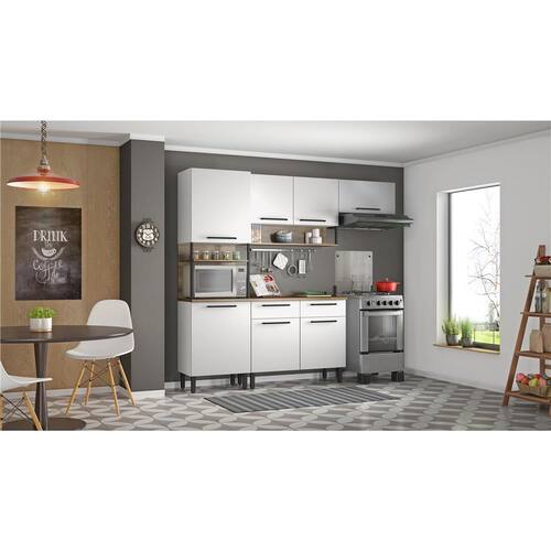 Além de tudo isso, essa linda cozinha conta com puxadores externos em alumínio com ponteiras em ABS, prateleiras internas e externas, gavetas com corrediças telescópicas, nicho para acomodar seu forno ou micro-ondas, tampo reto de 25 mm revestido com BP e pés fixos que asseguram maior estabilidade.