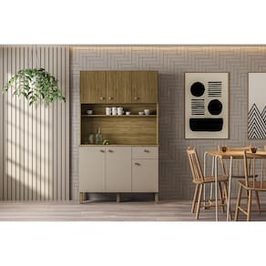 Seu visual é enriquecido pelo painel ripado decorativo em Freijó, que traz charme e um toque contemporâneo ao ambiente. O nicho aberto possibilita personalização, permitindo a exposição de objetos decorativos ou utensílios de uso frequente.