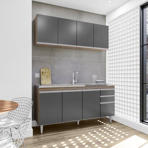 Características: Estrutura em MDP 15mm; Acabamento em melamina BP; Possui 8 portas com dobradiças metálicas; Possui 2 gavetas com corrediças metálicas; Possui 6 pés em PVC com regulagem de altura; Puxadores em alumínio; Amplo espaço interno; Fundo elevado; Pia produzida em aço inox e concreto aerado; Canais da pia inclinados; Superfície da pia plana; Furo para fixação da torneira; Peso suportado Armário: 35 kg distribuídos; Peso suportado Balcão: 40 kg distribuídos; ACOMPANHA PIA E CUBA.