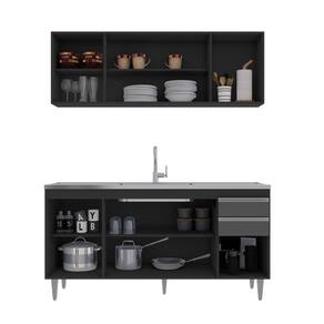 Cozinha Compacta Lorena com Pia e Cuba GhelPlus 160cm 8 Portas 2 Gavetas Preto Grafite Maderatto Móveis - Grafite | Preto