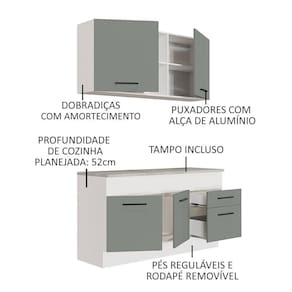 Outro diferencial desta cozinha são os pés reguláveis em PVC e os rodapés removíveis em MDP, que facilitam a limpeza. O balcão acompanha tampo em MDP com pintura Mood, que pode ser removido para instalação de pias de inox ou pedra, no espaço de 150 x 52 cm.