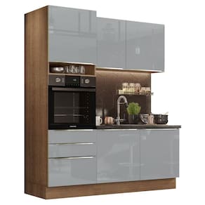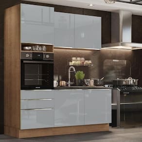 As medidas totais da cozinha são: 180 cm de largura x 225 cm de altura. A profundidade é de 60 cm nos módulos inferiores e 31 cm nos aéreos. O balcão comporta pias de 120 cm x 60 cm. Não acompanha tampo.