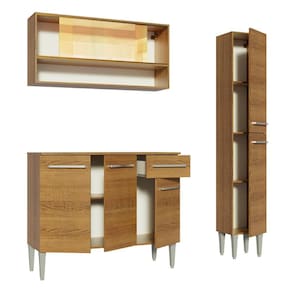 Acompanha um balcão de pia, um paneleiro e um armário aéreo, todos avulsos, podendo ser montados conforme a exigência do espaço. Os materiais de qualidade, como puxadores com detalhe em alumínio e corrediças e dobradiças metálicas são um grande diferencial, pois aumentam a vida útil dos móveis.