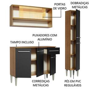 Acompanha um balcão, um paneleiro e um armário aéreo, todos avulsos, podendo ser montados conforme a exigência do espaço. Os materiais de qualidade, como puxadores com detalhe em alumínio e corrediças e dobradiças metálicas são um grande diferencial, pois aumentam a vida útil do móvel.