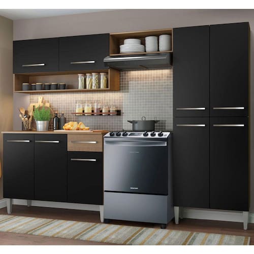 A Cozinha Completa Emilly se destaca por ser compacta e prática para o dia-a-dia. Seu espaço interno é bem distribuído e as tonalidadesamadeirado e preto combinam com ambientes modernos ou clássicos.