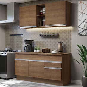 A modulação é composta por um balcão para pia e um armário aéreo. Super espaçosos e com ótimo tamanho, são perfeitos para organizar todos os utensílios e louças da sua cozinha.
