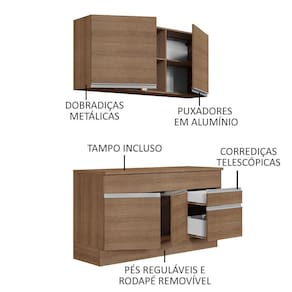 Fabricada com itens de qualidade, possui puxadores com perfil total em alumínio, dobradiças que amortecem o fechamento das portas e corrediças telescópicas que permitem a abertura total das gavetas.