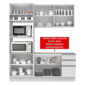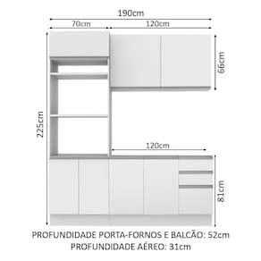 Outro grande diferencial desta cozinha é a profundidade maior, como uma cozinha planejada: 52 cm no paneleiro e balcão inferior e 31 cm no aéreo. As medidas totais da Cozinha Madesa Laura são: 190 cm de largura e 225 cm de altura.
