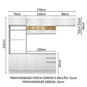 Outro grande diferencial desta cozinha é a profundidade maior, como uma cozinha planejada: 52 cm no balcão inferior e 31 cm nos aéreos. As medidas totais da Cozinha Madesa Marselha são: 270 cm de largura e 225 cm de altura.