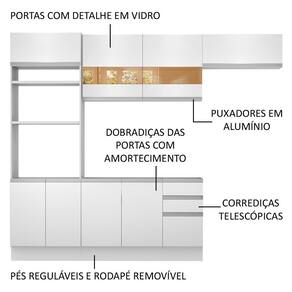 As gavetas possuem corrediça telescópica e todas as portas possuem amortecedor para o fechamento suave. Os puxadores são em alumínio e o aéreo possui detalhe em vidro reflex que traz modernidade ao ambiente.