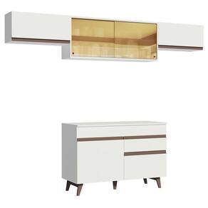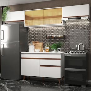 Esta modulação é pensada para otimizar o seu espaço, com dois armários aéreos com porta basculante e um aéreo maior com portas de correr. Além disso, o balcão possui duas portas e uma gaveta com corrediças metálicas, além de acompanhar tampo que pode ser removido para colocação de pia de inox ou pedra.