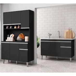 Conheça a Cozinha Compacta Márcia e Balcão Gabinete Com Pia Tatiane 120cm Preto, da AJL Móveis, ideal para você que está procurando uma cozinha compacta e funcional!