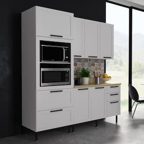 Especificações Técnicas: Altura: 222cm | Largura: 190cm | Profundidade: 52cm (Balcão) - 31,8cm (Armário) - 50,8 (Paneleiro) Material: MDF Balcão Compatível com Pia: Sim Tampo Incluso: Sim Corrediça: Telescópica Quantidade Total de Gavetas: 5 Quantidade Total de Portas: 6 Espaço para Forno e Micro-ondas: Sim