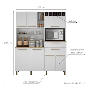 Características: - Estrutura em MDP e MDF de 15 mm - Espaço excluso para micro-ondas: Altura: 41 cm x Largura: 66 cm / Profundidade: 45 cm - 08 Pés de plástico reguláveis - Possui 7 portas e 2 gavetas - Puxadores ABS - Gavetas com corrediças telescópicas e com um divisor de talheres - Adega para garrafas - Dobradiças metálicas - Acabamento/Pintura: Semifosco - Gaveta medida 634x96x410 mm - Suporte de peso das gavetas: 1 kg - Garantia de 03 meses