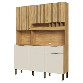 - Portas superiores com acabamento usinado de baixo relevo (frisado) no estilo ripado.