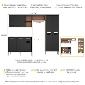 Cozinha: Altura: 184cm | Largura: 228cm | Profundidade: 27cm (aéreos e paneleiro) - 44,5cm (balcão com tampo)