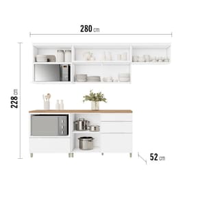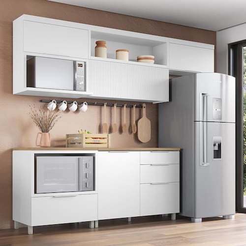 Detalhes sofisticados O armário aéreo de 120 cm é um destaque nesta linha, projetado com uma porta articulada canelada que segue a tendência de Milão, Itália. Este detalhe não só agrega beleza ao conjunto, mas também traz um toque de aconchego ao ambiente.