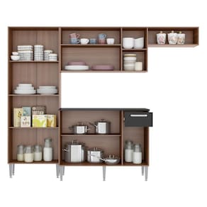 O paneleiro com prateleiras conta com um amplo espaço interno, assim como o armário aéreo e o balcão, o que ajuda você a manter todos os utensílios e mantimentos organizados. O nicho permite que você dê um toque especial ao ambiente, deixando no seu estilo preferido.