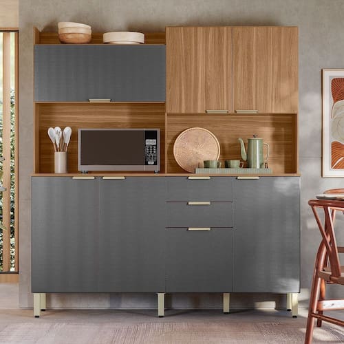 Características: Estrutura em MDP Acabamento em Pintura UV 02 Gavetas com corrediças metálicas 06 Portas com dobradiças metálicas 01 Portas com pistão a gás Puxadores em Plástico ABS Pés com Regulagem de Altura.