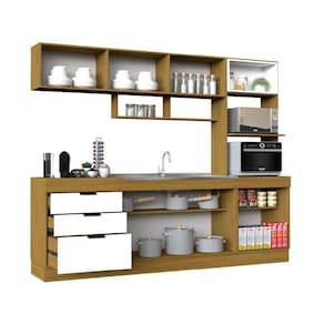 A Cozinha Compacta Primavera Bella é uma ótima opção para quem busca praticidade e beleza em um só produto. Ela possui 6 portas e 3 gavetas com corrediças telescópicas e dobradiças metálicas, que garantem maior durabilidade e facilidade de abertura e fechamento. Além disso, ela conta com um nicho exclusivo para forno elétrico e microondas, um porta-temperos e um perfil puxador em alumínio. O acabamento em freijó e branco brilho confere um toque de elegância e modernidade ao ambiente. Ean: 7899585710267