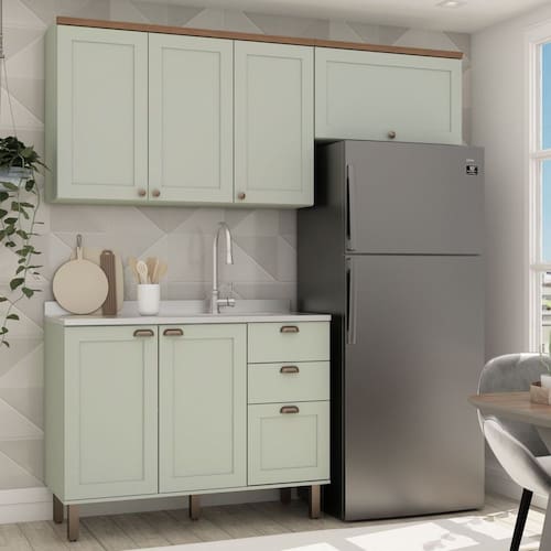 Cozinha Luminata composta por 3 módulos, balcão de 120cm com 3 gavetas com corrediças, 1 aéreo de 120cm com 3 portas e aéreo de 80 cm e gaveta com divisor de talheres. Todas as dobradiças são com amortecimento, corrediças telescópicas e portas no estilo provençal. Não Acompanha tampo de 1,20, o mesmo deve ser adquirido separadamente.
