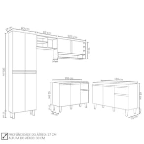 Conteúdo da Embalagem: 1 Balcão 120cm, 1 Balcão 105cm, 2 Armários Aéreos, 1 Paneleiro.