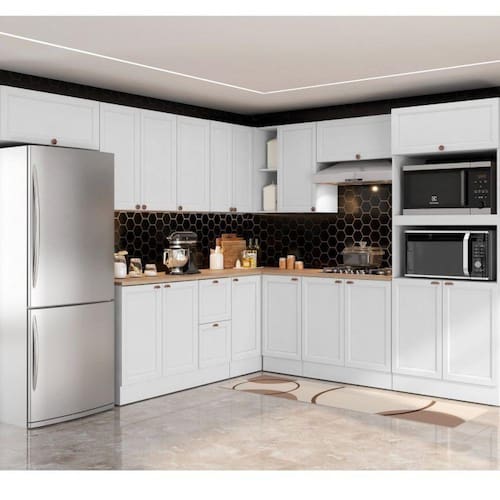 A Cozinha Modulada Completa de Canto 17 portas 2 gavetas Unna Espresso Móveis é uma composição elegante com portas almofadadas/molduradas em MDF inspirada nas clássicas cozinhas internacionais. São 10 módulos que esbanjam praticidade. Amplo espaço interno, pistão a gás nos módulos aéreos basculantes, balcão 1,20m c/ tampo que pode ser utilizado com pia de 1,20x0,50m, balcão de 0,80m com prateleira removível podendo acomodar objetos maiores, nichos para forno e micro-ondas, gavetas com corrediças telescópicas, dobradiças reforçadas de 35mm, puxadores modelo retro em polímero, pés em PVC 14,5cm reguláveis e rodapés removíveis com presilhas modelo click. Perfeita combinação para o seu lar. Qualidade que só a Poliman oferece.
