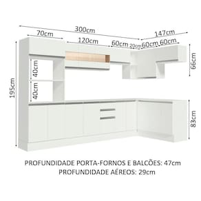 Possui puxadores em alumínio, corrediças e dobradiças metálicas e rodapés encaixados com pés em PVC com regulagem de altura. Seu aéreo em vidro agrega beleza e sofisticação. Possui nicho para utilizar como adega ou para objetos e decoração. Seu modulo de canto proporciona um total aproveitamento do ambiente, ganhando muito mais espaço.