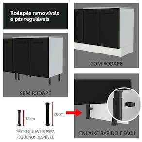 Por fim, os pés reguláveis em PVC com rodapé removível em MDP de encaixe fácil, para facilitar na hora da limpeza.