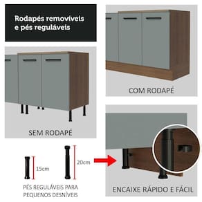 Para completar, os pés reguláveis em PVC com rodapé removível em MDP de encaixe fácil, para facilitar na hora da limpeza.