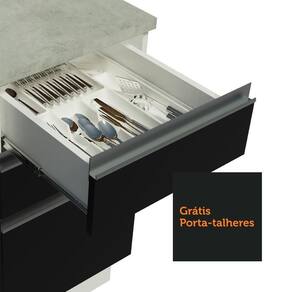 O acabamento da estrutura é branco e o das portas e frentes é preto. Feito em Pintura Poliéster ecológica, com aplicação de 7 camadas de proteção resistentes a álcool, água e calor.