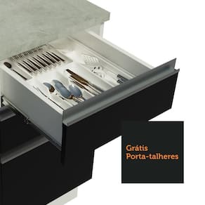 O acabamento da estrutura é branco e as portas e frentes são pretas. É feito em Pintura Poliéster ecológica de alta resistência, que confere maior durabilidade e durabilidade ao móvel e oferece proteção contra os efeitos da água e do calor.