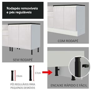 Para completar, os pés reguláveis em PVC com rodapé removível em MDP de encaixe fácil, para facilitar na hora da limpeza.
